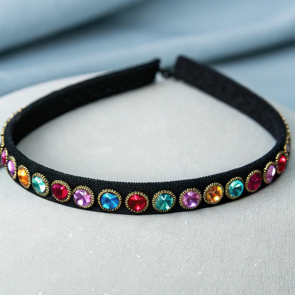 This stunning choker necklace features a sleek black band adorned with vibrant gemstone accents. The gemstones are carefully selected for their brilliance and color, adding a pop of elegance to any outfit. Designed with a secure clasp, this piece offers both comfort and style. Perfect for evening events or adding a touch of glamour to casual looks.